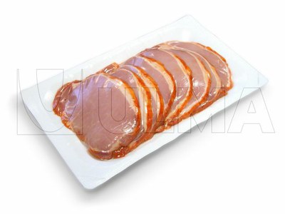 Polędwica w plastrach pakowana w opakowanie typu skin pack w folię twardą na maszynie termoformującej.